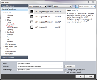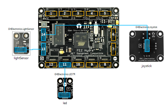 After we click “OK”, a new Gadgeteer project will be created and the Gadgeteer GUI designer appears showing an image of the FEZ Hydra mainboard. If we open the Toolbox we will see a list of modules under the “GHI Electronics” section. We’ll select the Joystick module and drag & drop it onto the white area somewhere around your mainboard. Then we’ll do the same for the LED7R module and the LightSense module.