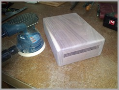 | Using an orbital sander, I smoothed out any problem areas using 80 grit sandpaper then followed up with 120 grit sandpaper over the entire box. No reason to smooth it any further at this point. We’ll save the fine sanding for later. |  |