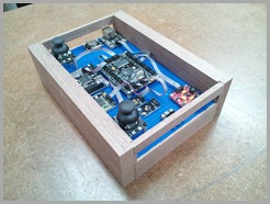 It just happened that I’d been talking to Steve Presley, who is starting up a custom CNC & 3D printing service, about building some mounting boards for Gadgeteer projects. I gave him some dimensions and he went to work. A few days later, I received a perfectly CNC machined piece of 1/4” blue acrylic in the mail and I went to work building the box that would house it.