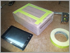 | Time to cut a whole for the CP7 display. Since it’s hard to see pen marks on the dark walnut, I add some green tape to the areas to be cut and then mark out the opening for the display. |